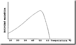 | Fig. 5 Variación de la actividad enzimática en función de la temperatura. Nótese que a partir de cierta temperatura la enzima se desnaturaliza y deja de actuar. |